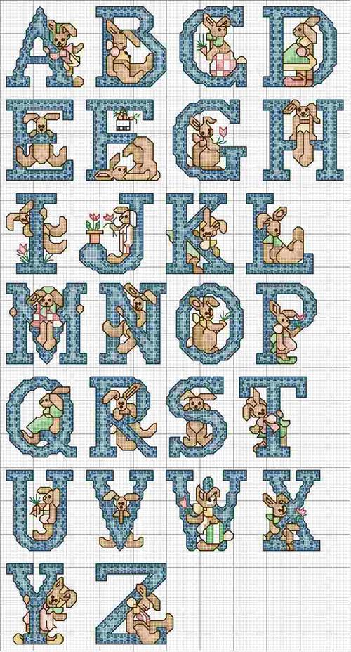 Artigo relacionado alfabeto em ponto cruz contenido em moldes de letras.